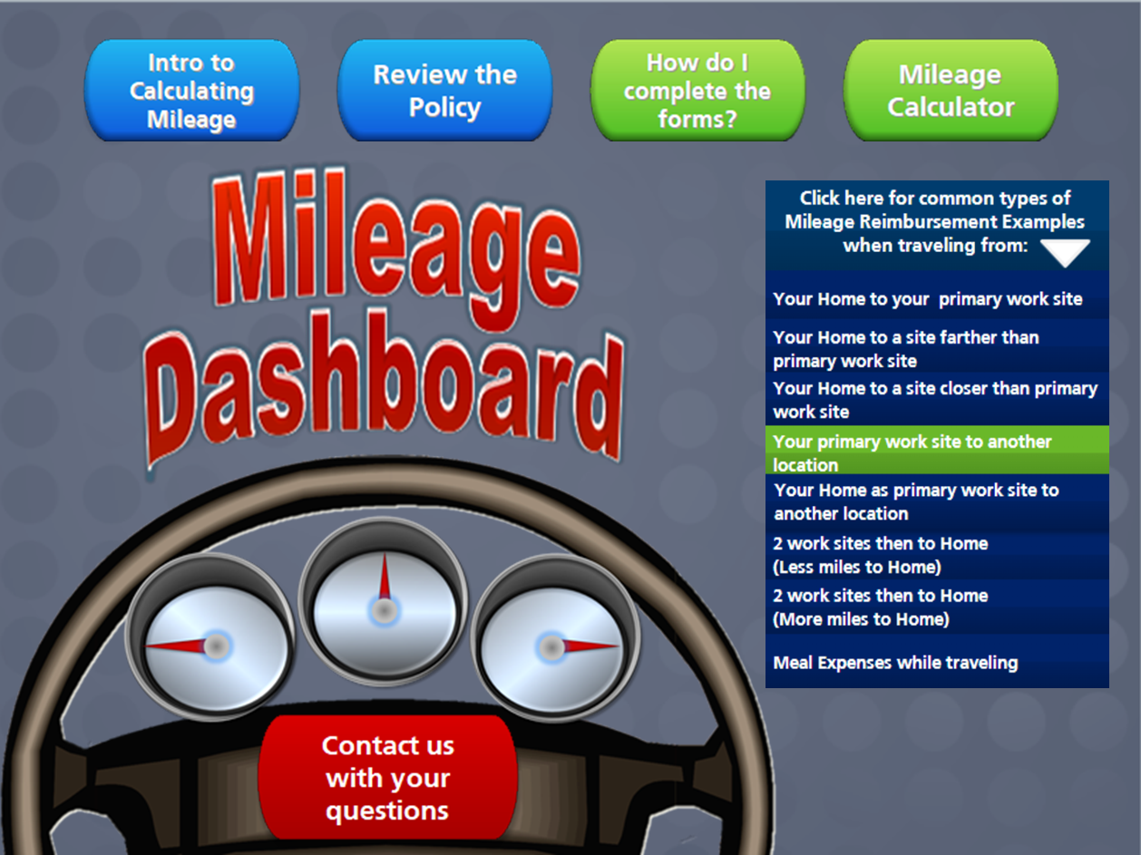 Not all learning strategies require formal training—sometimes a well-designed job aid or tool is more effective. The Mileage Dashboard was developed in response to a training needs assessment conducted for employees across corporate and agency locations. Calculating mileage reimbursement can be complex, with numerous scenarios and policies to consider. While leadership initially requested instructor-led training to introduce procedures and best practices, the assessment revealed potential skill gaps and low retention post-training. A more sustainable and accessible solution was needed. The result was an interactive dashboard that allowed employees to explore real-world scenarios, input mileage calculations, and receive immediate feedback. This tool provided on-demand support, reinforcing learning while reducing the need for repeated instruction.